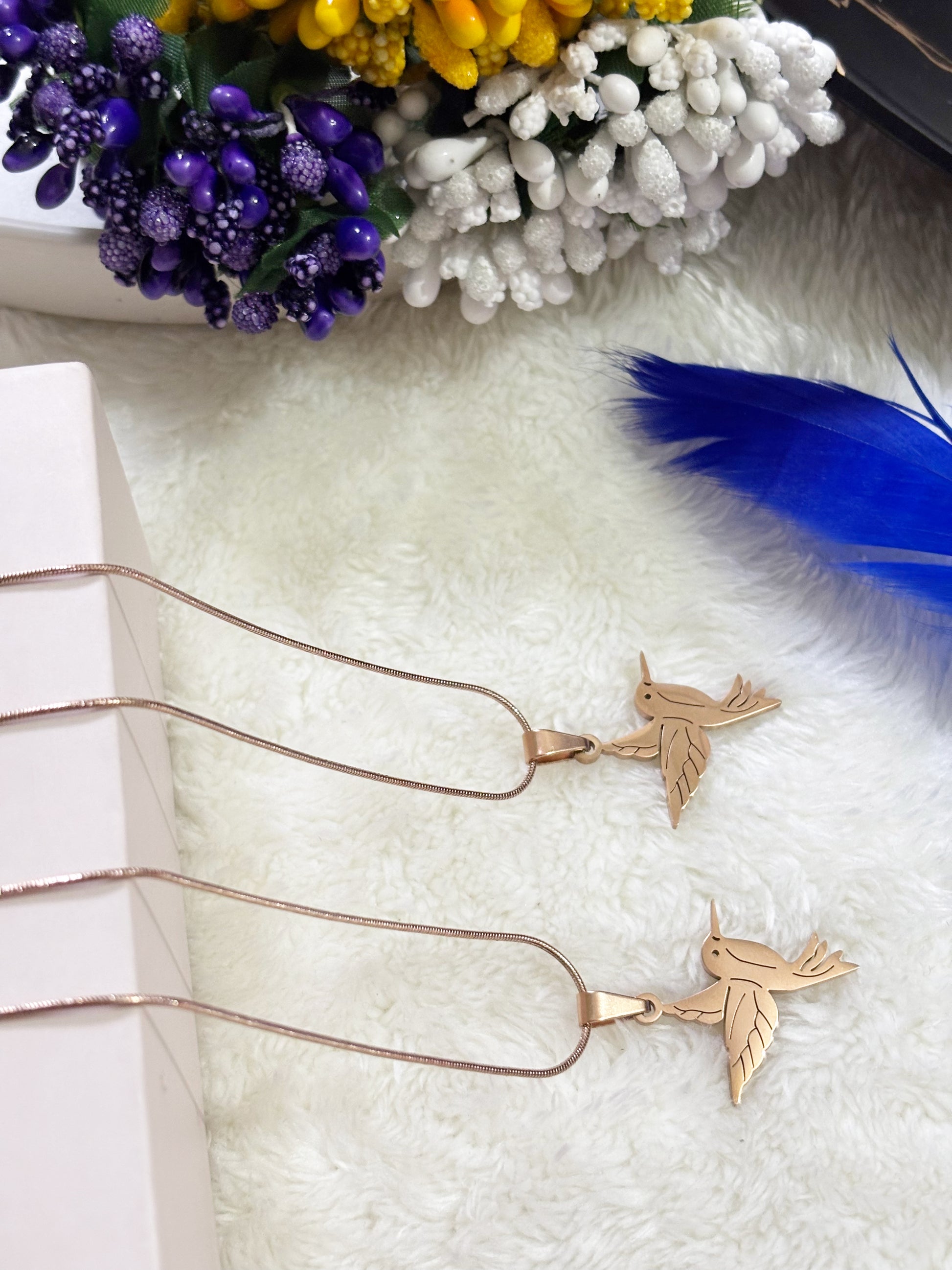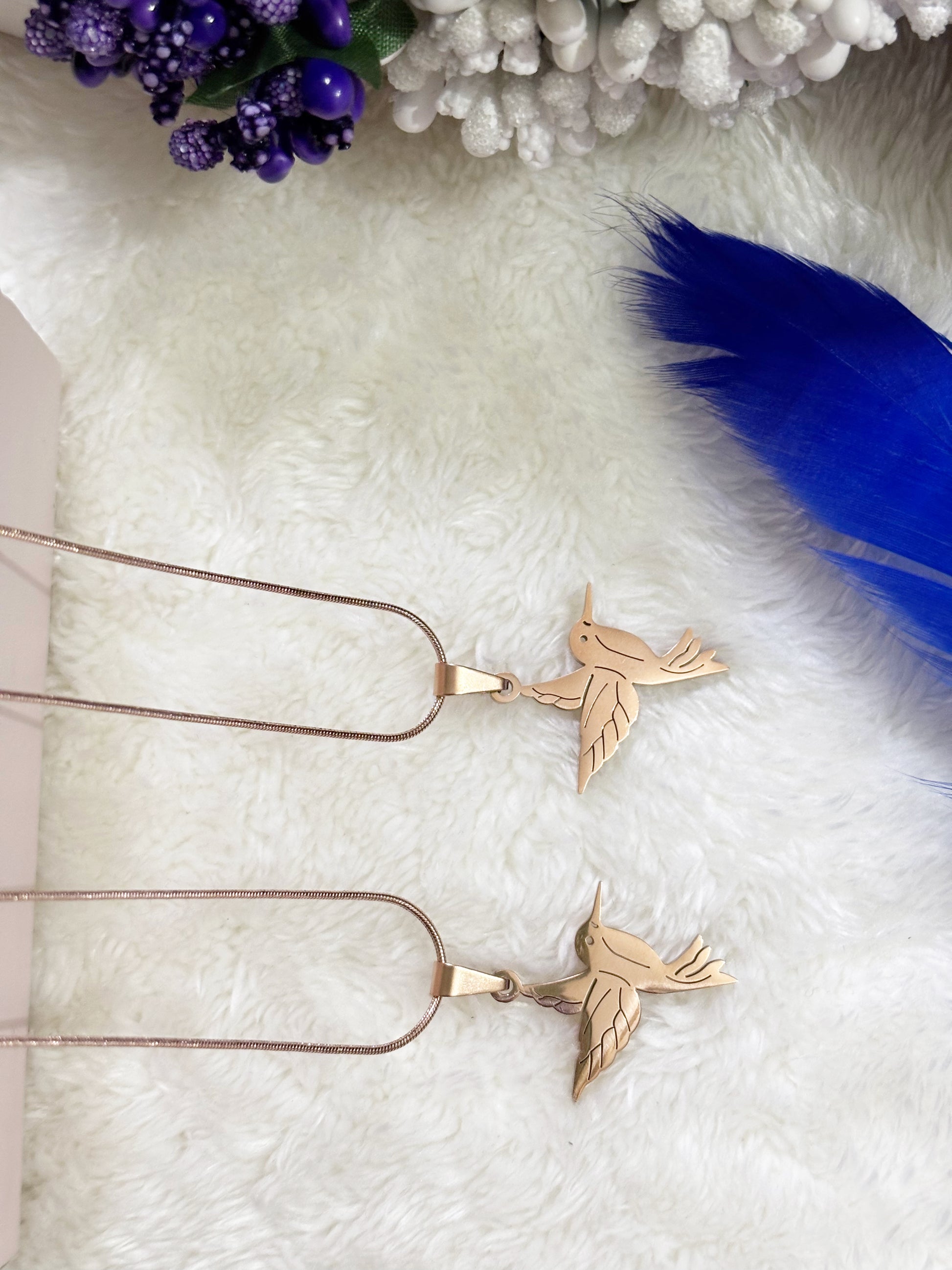 This elegant necklace features a finely crafted flying bird pendant in a soft rose-gold finish, designed to symbolize freedom, hope, and new beginnings. The minimalist silhouette is enhanced with subtle engraved details on the wings, adding depth and refinement without overpowering the design. Paired with a sleek chain, the pendant rests beautifully, making it suitable for everyday wear as well as special occasions. Its timeless appeal and nature-inspired motif make it a meaningful accessory and a thoughtful gift for someone special.