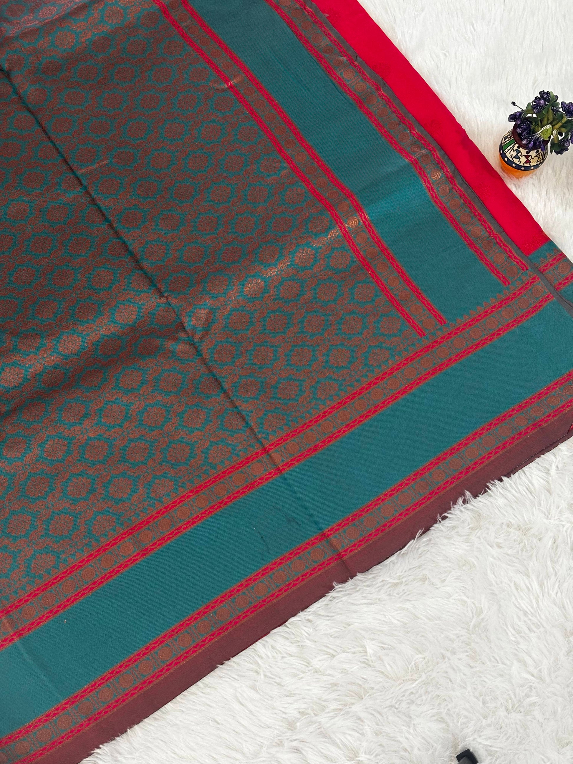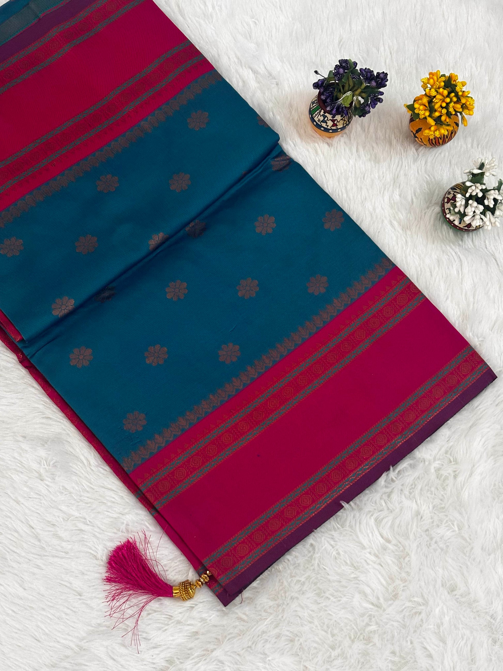 This vibrant saree features a beautiful combination of Teal Blue & Magenta Dual-Tone Silk Saree creating a striking and festive contrast. The body is adorned with subtle woven floral motifs that add charm and elegance, while the contrasting border showcases intricate traditional patterns woven in a complementary tone. Finished with decorative tassels at the pallu, this saree exudes classic ethnic appeal. Perfect for festivals, weddings, poojas, and cultural celebrations, it offers a graceful blend of traditional craftsmanship and timeless style.