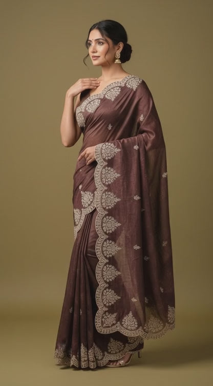This luxurious berry wine saree features a rich, subtly textured fabric beautifully enhanced with intricate white embroidery that creates a refined and elegant contrast. The ornate border is adorned with detailed floral and paisley-inspired motifs, adding a classic and graceful touch. Delicate embroidered accents scattered across the body balance the design with understated sophistication. Perfect for weddings, festive occasions, and evening celebrations, this saree offers timeless charm and effortless elegance for a standout ethnic look.
