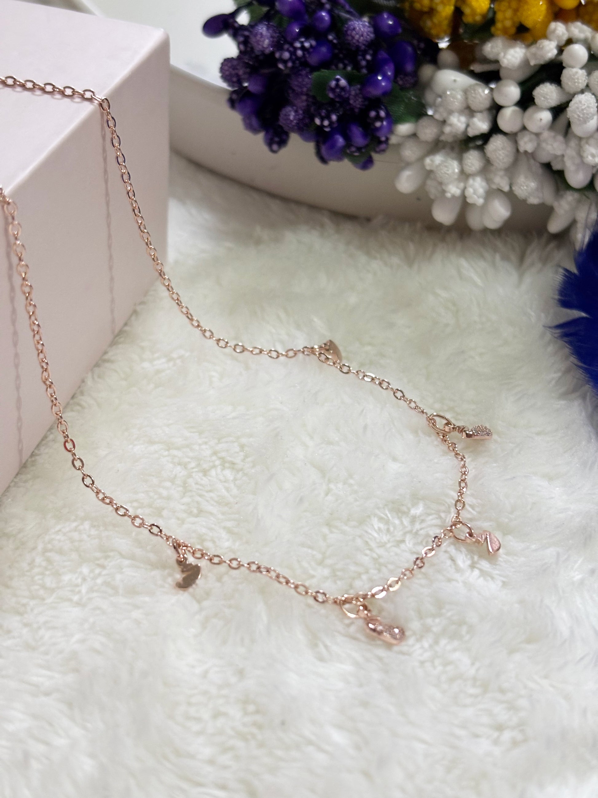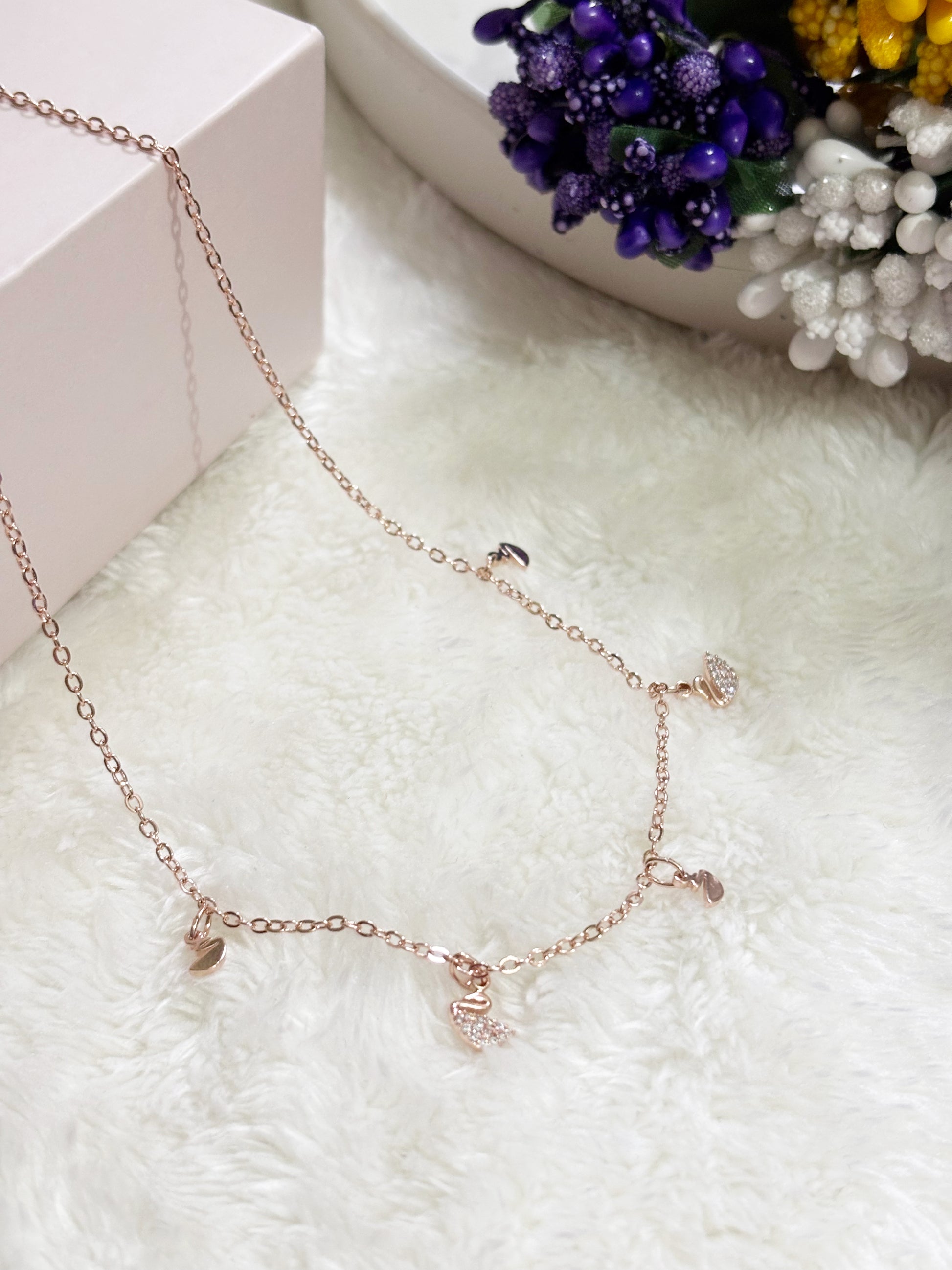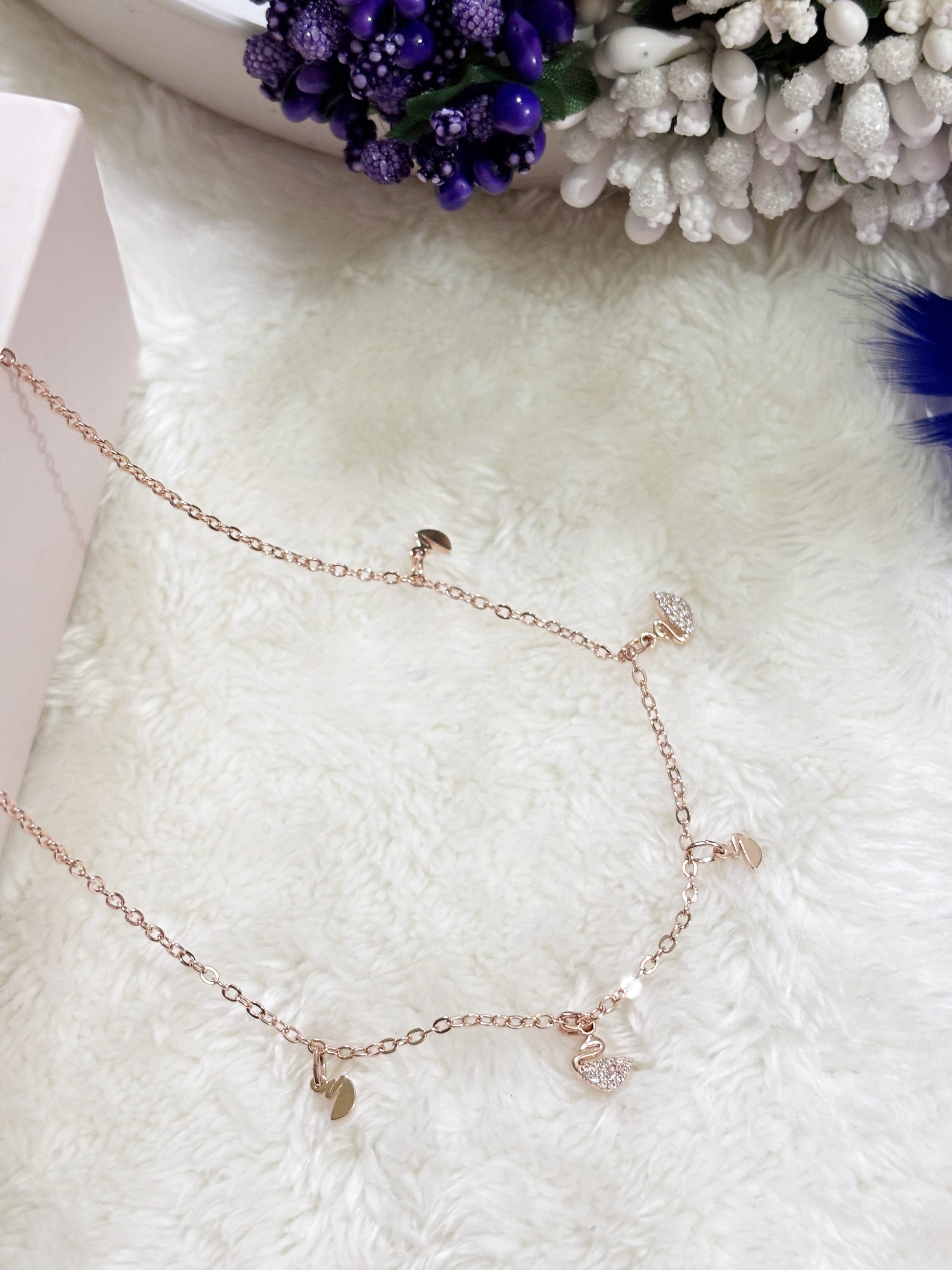 This delicate Necklace features a refined rose-gold chain adorned with charming accents, highlighted by a sparkling swan-shaped charm at the center. The swan motif symbolizes grace, beauty, and elegance, while subtle crystal detailing adds a soft shimmer. Additional small charms along the chain enhance its playful yet sophisticated appeal. Lightweight and beautifully balanced, this Necklace is perfect for everyday wear or special occasions, making it a timeless accessory.